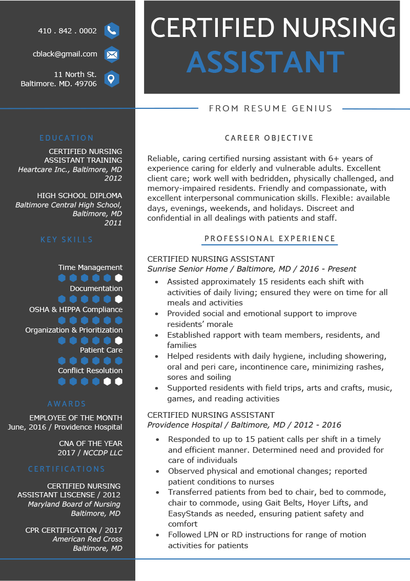 If youre not sure how to phrase your skills, or if you want examples of objective statements, visit some job websites for ideas. Certified nursing assistants, or cnas, play important roles in the medical field. While physicians, physician assistants and registered nurses take care of the major decision making for.